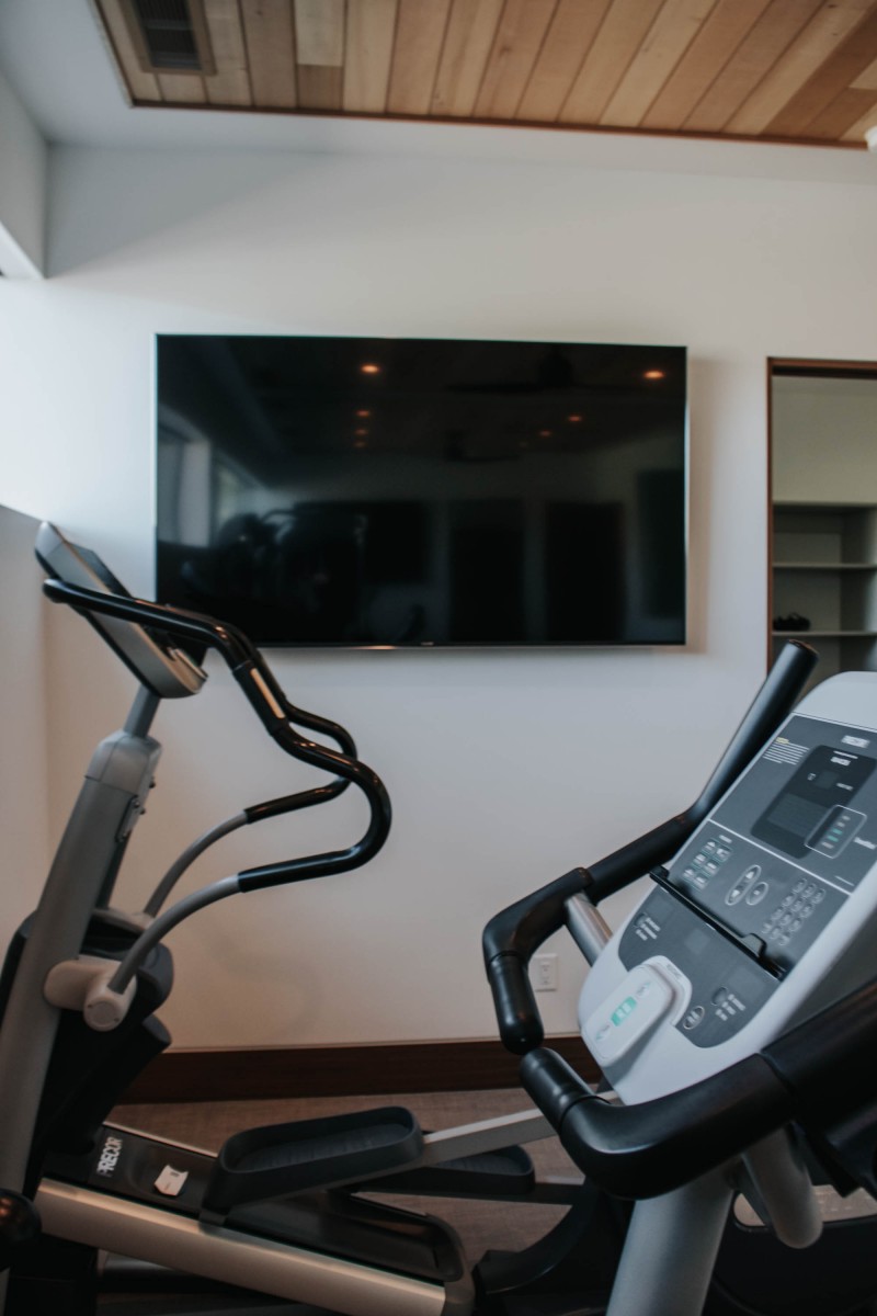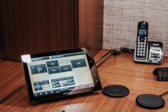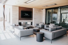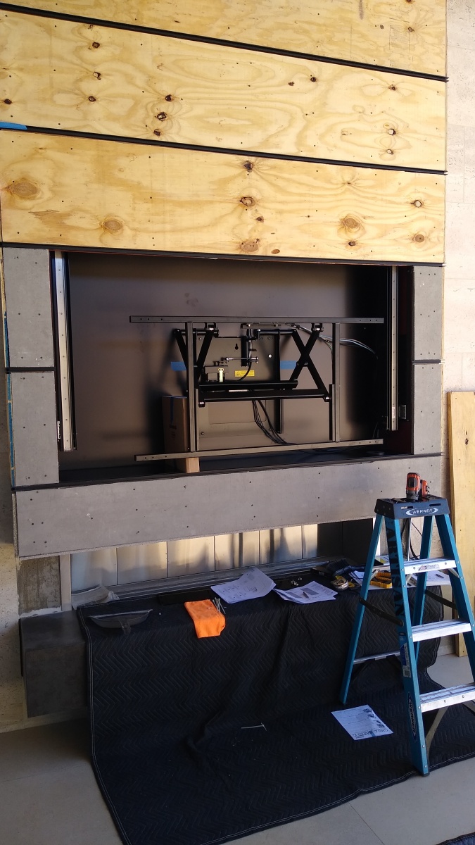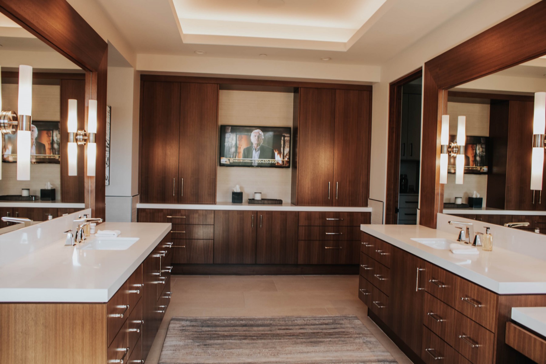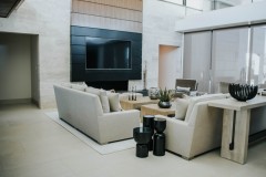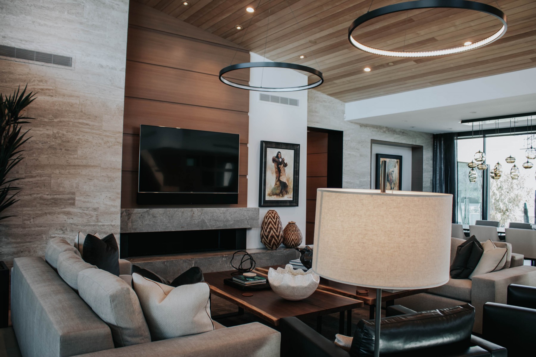 Beautiful contemporary home in North Scottsdale featuring a variety of integrated solutions featuring barely visible high-performance speakers, a television that raises from a countertop next to the BBQ, and television that hides behind beautiful metal paneling when not in use. A Crestron home automation system elegantly integrates lighting control, motorized shades, climate control, garage door control, surveillance cameras, and whole-home audio video control into one simple-to-use interface.